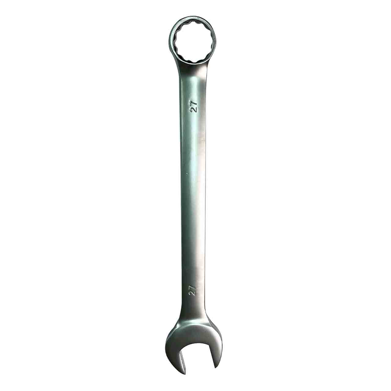Ключ комбинированный рожковый 27 мм используется при работах с различным шестигранным крепежом. Гаечный ключ 27 мм прямой формы имеет рожковую и накидную головки. Двухсторонний ключ выполнен из прочной CRV стали с хромированным покрытием для предотвращения выскальзывания из рук и исключения бликового ослепления.